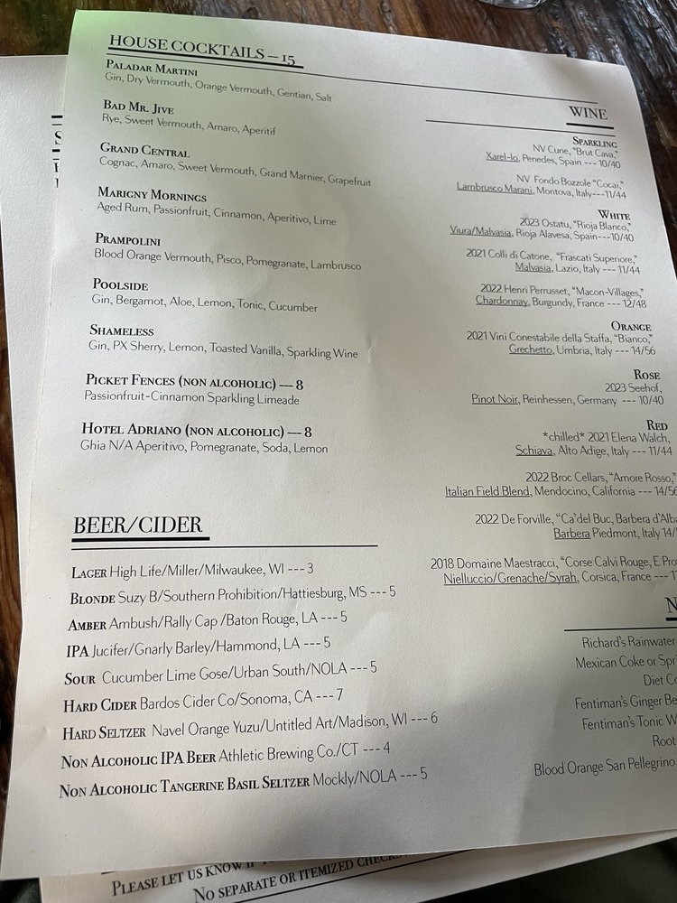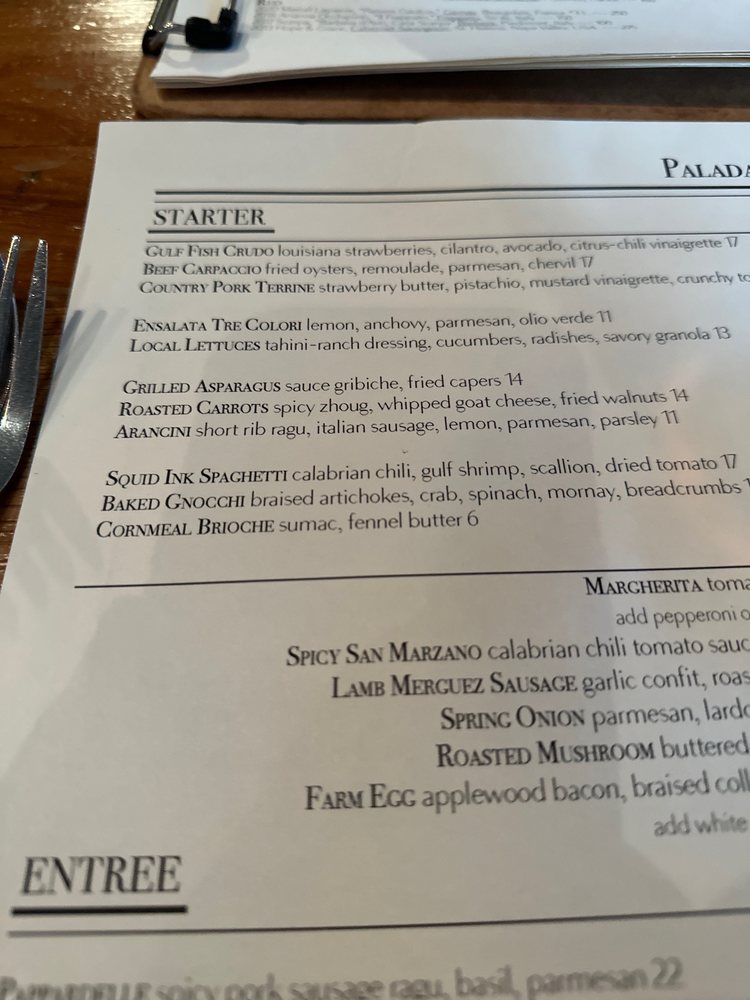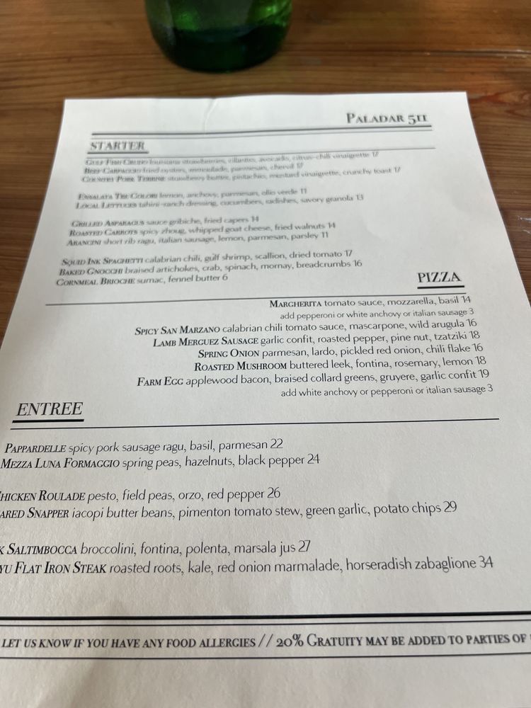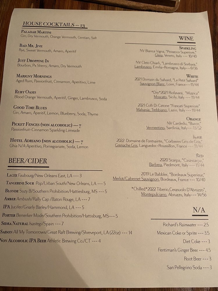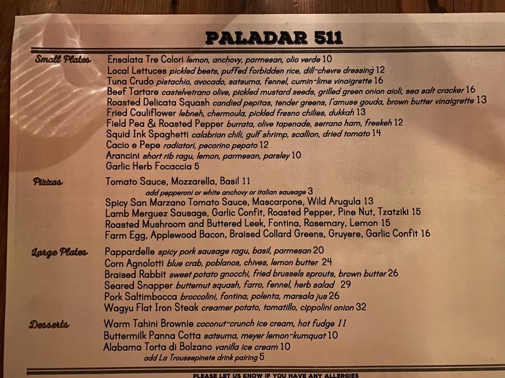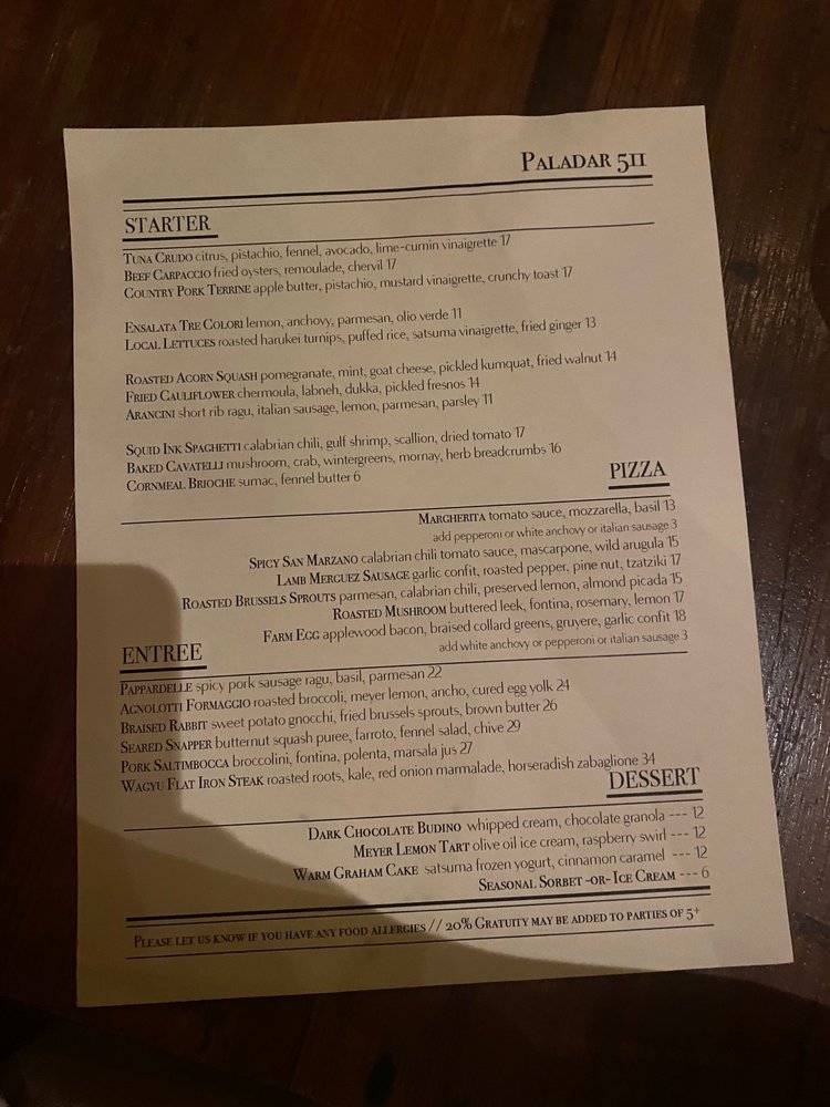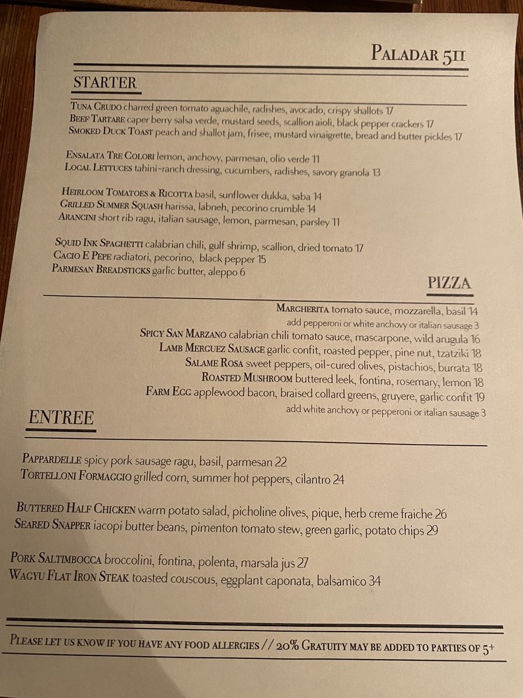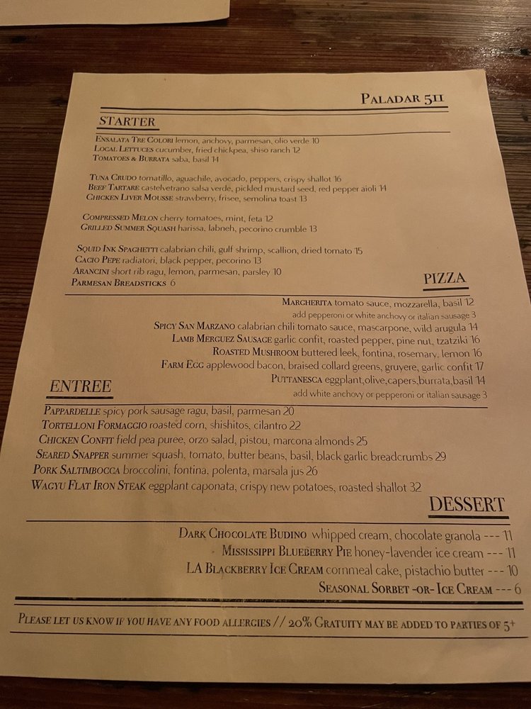 Introducing the menu at Paladar 511, a trendy New American, Pizza, Breakfast & Brunch restaurant in New Orleans. The diverse menu offers vegan and vegetarian options, featuring dishes like Jumbo Lump Crab Benedict, Carpaccio with fried oysters, and Wagyu Flat Iron Steak. Customer reviews highlight the delicious Crispy Chicken and Pork Saltimbocca, as well as unique cocktails like ginger beer with smashed sage. The restaurant's intimate ambiance and attentive staff contribute to a memorable dining experience. Notable dishes include the sea bass, crispy arancini, and the flavorful squid ink spaghetti, making Paladar 511 a must-visit for food lovers seeking a modern twist on classic flavors. With a great wine selection and tasty appetizers like cornmeal bread and arancini, this restaurant offers a clean and inviting atmosphere for a delightful dining experience.